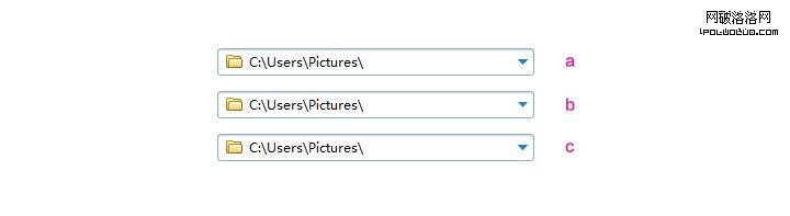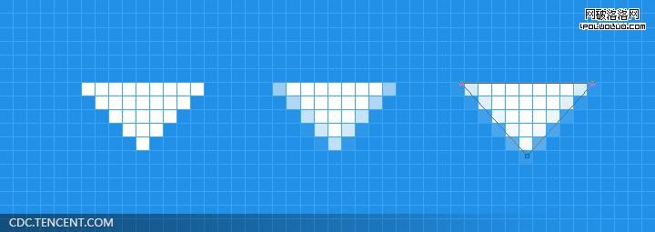 在界面設計中,經常會繪制下拉菜單等控件上的三角形箭頭形狀,最常見的做法就是用鉛筆工具點象素畫出來,如圖7-a所示,看上去很清晰,但在分 辨率較小的屏幕上看,會稍顯生硬、有鋸齒感,影響界面的細膩度;用路徑對齊網格繪制箭頭,如圖7-b所示,解決了鋸齒問題,但看上去體量感被削弱了,不夠 飽滿;圖7-c中所示的效果,是對次像素微調後的效果,既消除了鋸齒,而且在體量感上不輸第一種方案的效果。