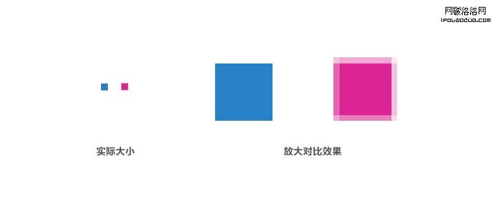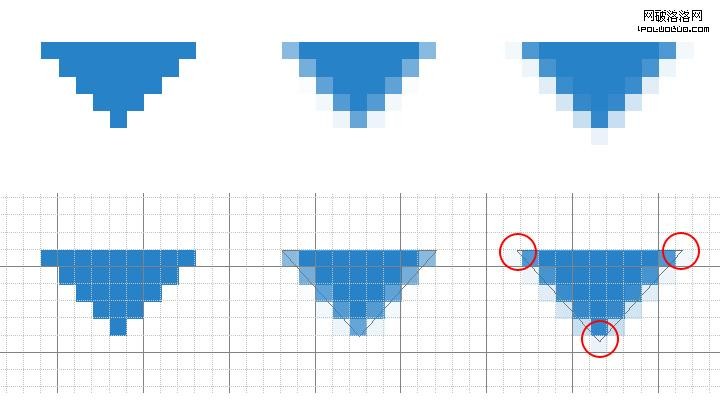 當然,對象繪制、變換時像素對齊網格並不是PS CS6獨有的功能,只是更智能更好用了,PS CS6的像素自動對齊網格功能在繪圖過程中,無疑方便了很多,不必再擔心圖形邊緣會出現模糊,但是我們在實際的圖形設計過程中會發現,還是會經常需要調整 一些路徑沒有完全對齊到網格產生的半透明的過渡像素,用來平滑圖形邊緣減少鋸齒感,或讓圖形看上去更飽滿、更細膩,我們稱其為次像素 (或亞像 素,Sub-pixel,一般用於屏幕顯示技術等領域),如下圖所示。