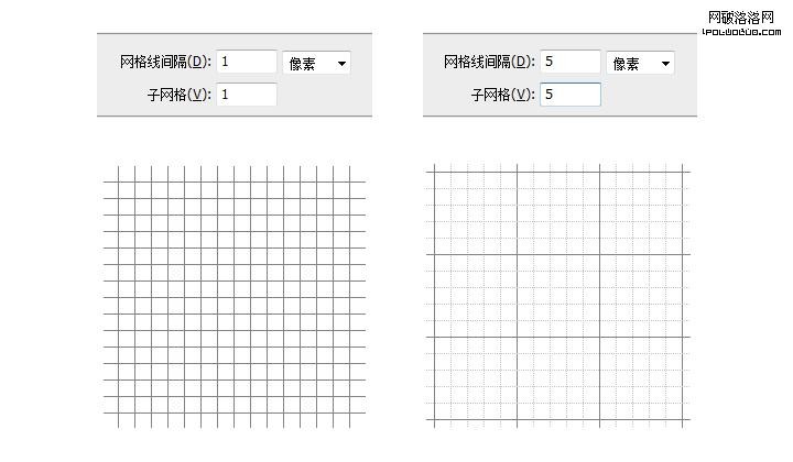 圖3中可以看到網格線間隔的默認值是25毫米,將單位改為像素,這時單位前面的數值會自動變為1,這時的網格線並未與畫布上的像素格對齊,需要 手動重新輸入數值,且網格線間隔數值與子網格數值必須相等,圖4展示的是在3200%比例下,兩種不同數值網格所呈現出的效果,可根據自己的喜好進行調 整。網格可通過主菜單“視圖>顯示>網格“來顯示或隱藏,快捷鍵為Ctrl+’(回車左側的引號鍵)。