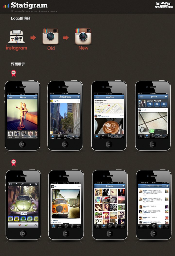 Instagram從1.0到如今的2.0的蛻變,界面和LOGO都發生了很多質的飛躍。LOGO調整的更加精細寫實了。從之前的扁平質感的彩帶LOMO照相機演變成了現在新版的濃質感立體化的鏡頭,使得整個APPS更顯高貴和升級之感。界面功能增加了很多濾鏡效果。圖片質量也提高了不少,最主要的是服務器容量做了比較大的改善,速度加快了很多。