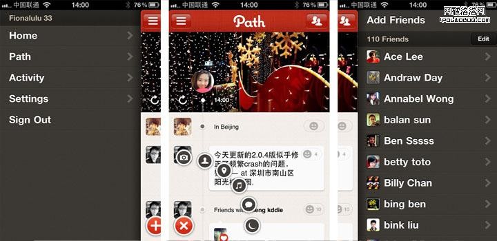 Path:這個APPS是非常值得一提的一款應用程序,這是由兩個前 Facebook 員工精心打造出來的“密友社交平台”已經突破了 100 萬的用戶數量,它在這次2.0改版之後,做了一個華麗光鮮的轉身,把許多同類產品都遙遙的甩在了身後。直接領跑整個圖片類社交分享圈子,無論是在功能和界面設計上都做的相當的精致出位,很受大家的喜愛追捧。