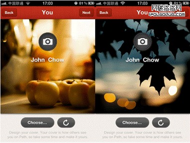 令人耳目一新的華麗界面,當用戶登錄新版本的Path時,將可以按照自己的喜好更換自己主頁的背景圖片,用戶可以通過自定義這張“背景圖片”,來向好友們展現自己的審美觀念,有點個人博客的感覺。這裡處理頭像的手法也是相當的精致,很巧妙的和主頁背景COVER所結合,配以醒目的英文名字和基本信息作為主頁標題,整款APPS在首頁進入就帶給人們不一樣的精致度,再加上IOS顯示的精細度,將這款轉型後的Path展現的凌厲盡致。可以用幾個關鍵詞來形容:革命突破性的顛覆;最具獨特的創新轉型;與同類產品的競爭潛力提升百倍。