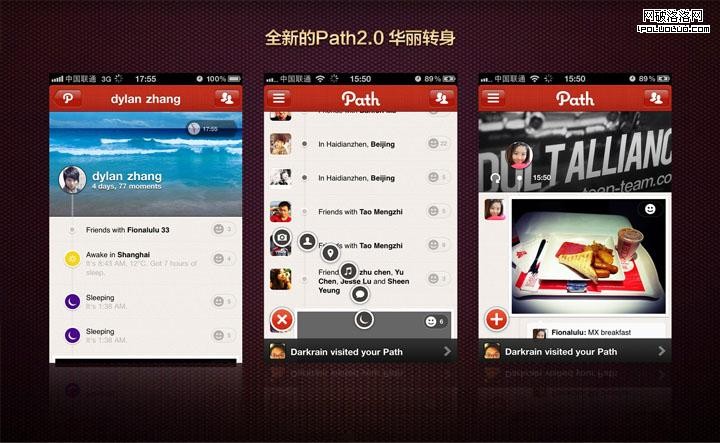 Path其實是一個私人圖片社交圈子,它只能夠添加你最親密的50人作為好友,它讓你不能不想部分受眾SAY NO。這樣也同時很好的建立起互聯網上第三種社交網絡類別。2.0的path是模擬了一本智能雜志的形式,可以幫助您分享生活,愛人,你的想法,你聽的好聽的歌曲,視頻。新版更增加了時間軸排列的信息,讓你更加清晰的看來一路走來的時間、地點、人物和事件,更加好的幫助回憶過往發生的事情。新版還添加了有意思的喚醒功能,當你睡覺和醒來的瞬間,只要玩過Path,就可以輕松識別您的地理位置和睡覺的時間,讓你最私密的好友們最清晰的第一時間了解你的動態。還可以讓你的朋友知道你在哪裡共享路徑上的地方。同時也可以看到你好友添加了哪些朋友,從而加密關系鏈。