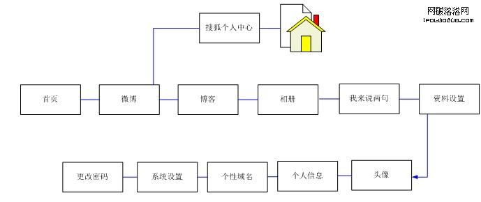 用戶可從搜狐網首頁選擇進入通行證和個人中心,通行證主要承擔關聯賬號功能、修改密碼、個人信息修改、找回密碼等功能。搜狐個人中心主要承擔著與子項目之間相互的交互,用戶只需在個人中心即可享受多種服務,發博客,發微博,上傳照片。更改密碼跳轉到搜狐通行證用戶在用戶中心操作,如發布博文,系統會自動生成當前沒有昵稱的用戶生成一個昵稱