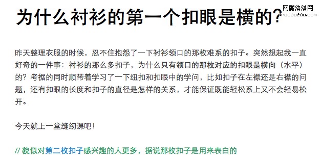 保羅本耐特(Paul Bennet)同學是IDEO的一位設計師同志,他把他的博客叫做好奇編年史,在這個博客裡記錄了關於盆栽、伊卡特針織、人類對於超級大樹喜好等等;Localhost同學是ThoughtWorks的一位設計師同志,她的博客裡同樣記錄著關於冷笑話的設計模式、尿鐘法的可行性、以及站在巨人肩膀的詭辯,就像下面這個關於襯衫位置的問題: