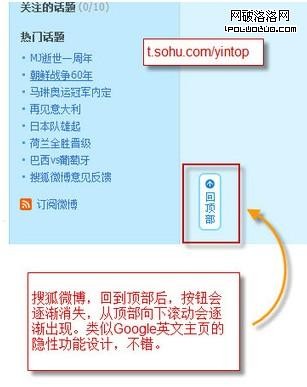 有時候我們會發現頁面上一個小小的按鈕,可能會讓我們的訪客愛不釋手,同時可以提供我們的訪客一個更加方便快捷的閱讀環境,其實有時候我們也非常有必要添加方便用戶浏覽閱讀文章的按鈕或圖標,舉兩個最常見的例子,首先是“回到頂部”的小按鈕,這個按鈕看似簡單,但是用處卻很大,如果你的內容頁面內容較多,跨越的幅度較大,相信使用這一按鈕來取代滾輪會使你的內容頁面對訪客來說更加的友好,這點我們可以從一些大型的站點、微博、百度百科等都可以看到這種小按鈕,如下圖所示的是搜狐回到頂部小按鈕: