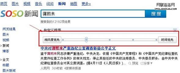 有的情況下小按鈕並非只是建立在方便用戶閱讀的基礎上,也可能是能通過創新吸引訪客,我們可以舉個例子,看看搜搜新聞的頁面,如下圖所示,設計的是一個類似坐標軸,一邊是相關度優先,一邊是時間優先,功能跟百度新聞是一樣的,但是創新而且直觀方便的設計往往會更加受到訪客的青睐。