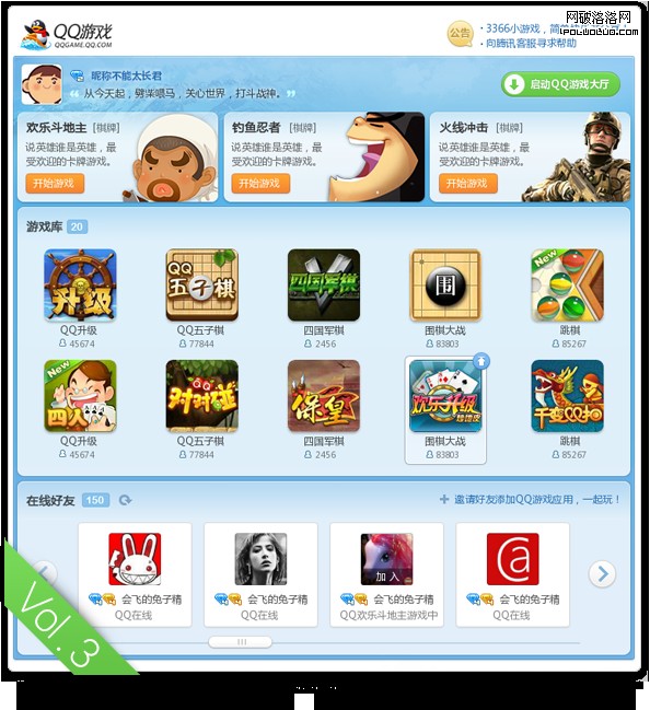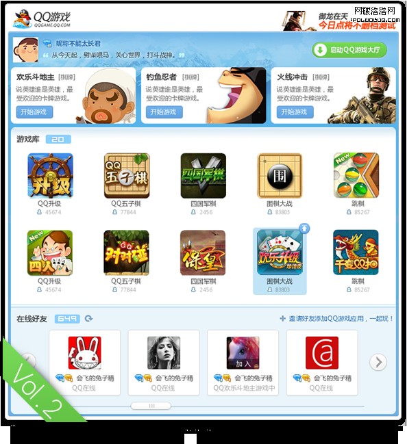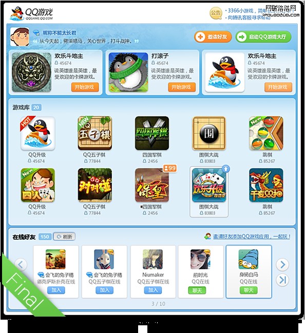 最後定稿,我們將游戲推薦板塊的形式做了小小的調整,因為之前的形式會讓用戶看起來像是廣告。“在線好友”板塊的滾動條最後還是去掉了,換成了翻至首頁和翻至尾頁按鈕,最後,還在版面頭部加上了“邀請好友”按鈕。