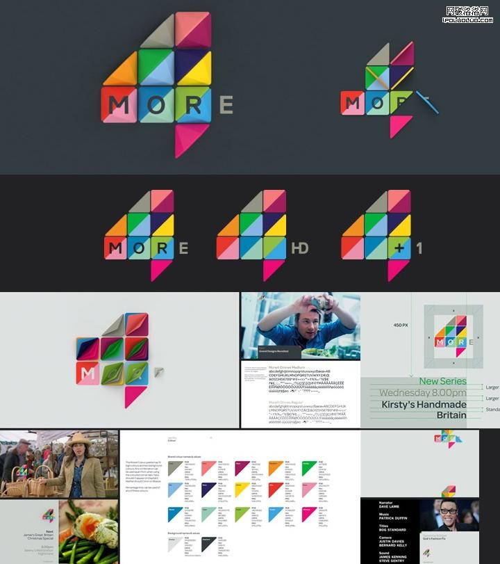 由多個可自由變換組合的彩色三角形組成的標志是這次More4(英國廣播電視公司推出的第四頻道)渴望華麗轉型理念的視覺表達。可隨節目不同而變換顏色,自由翻轉變化且極賦裝飾性的三角形圖案不僅是電視媒介一個嶄新的嘗試,更是在迎合人們當下對於生活方式、美食文化、時尚品味的審美情趣。