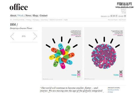 舉例來說,IBM的智能星球運動(Smarter Planet campaign)涉及到多個方面的主題,與其相關的印刷品、插畫、圖表、人機互動素材等都遵從著同一套方案標准,包括幾何框架、線條風格、色彩飽和度等。無論是在網站,還是在平面媒體中,相關主題的視覺表現形式都具有高度的一致性。