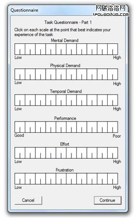 自我報告式評估法。主要是讓被試填寫心理學量表來測量心理負荷水平。我們目前使用美國航空航天局開發的軟件版NASA-TLX量表測量用戶完成一項測試任務時的心理負荷水平。NASA-TLX量表是目前適用范圍最廣、效度最好的心理負荷量表之一,同時它簡單的結構也非常適合日常的用戶研究工作。
