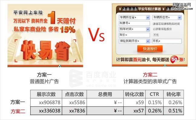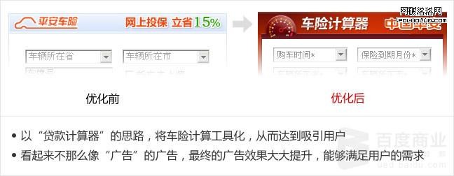 例如:將“平安投保 網上投保 立省15%”轉化成為“車險計算器”,以工具化的概念來吸引用戶,看起來不那麼像“廣告”,最終的廣告效果大大提升。