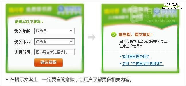 我們還要注意交互提示以及提交成功後的交互方式,在提示文案上,一定要言簡意赅,不要過於啰嗦的提示用戶遇到的問題。當用戶點擊成功後,最好讓用戶多一些選擇和了解更多相關內容。(如下圖)