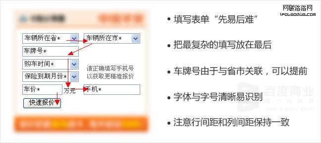 了解清楚,表單與表單的交互關系,表單的屬性,下拉選擇菜單,文本域,單選、復選框,按鈕之間的交互關系和規則。排列順序應該根據用戶填寫的先易後難的順序進行排列布局。經過研究測試,這樣會降低用戶的流失率,提升提交的有效用戶數。(如下圖)