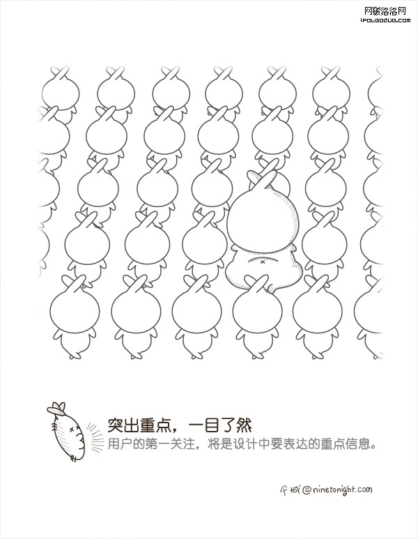 看到這張照片,我們一眼能夠看到天宏(圖中這位UED俊男)的眼睛。我們能從他的表情裡讀出一些他的性格。一張好的攝影作品,最重要的一點,就是這個照片是否有焦點,照片的主題是否一目了然。而攝影作品的用光、構圖、景深等等手法,其實就是在讓一個照片能夠有其焦點,並且利用這些藝術手法來烘托氣氛,提升主題。 一個優秀的頁面亦如此:應當突出重點,一目了然。相信大家也知道,一個用戶在浏覽網頁的過程中,只是掃描頁面,而不會像是在看書似的閱讀每一處地方,每一行文字。一個網頁呈現在用戶面前的時候,應該在5秒之內,就能理解:這個頁面是干什麼的?我大致能通過這個頁面做些什麼?接下來我該去哪裡? 我們網站上的每個頁面都可以是任務流上的一個點。這個點上包含著用戶需要的信息,也許是繼續找到任務流的下一個點的信息(例如導航),也許是用戶想找到的最終內容。而一個頁面上存在著上百甚至上千個鏈接(淘寶的寶貝詳情頁面通常有700多個鏈接),要在這樣茫茫大海中找到用戶需要的鏈接,可見,“突出重點,一目了然”是多麼重要。