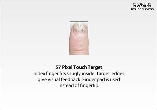 有的用戶喜歡用食指進行操作,而用拇指的用戶更是大有人在。兩者最大的不同在於拇指更寬。一個成年人的拇指寬度大概是25mm,換算之後大約是72px。