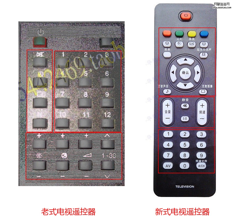 我們再來看電視機的遙控器。左邊是老款遙控器,右邊是新款遙控器。