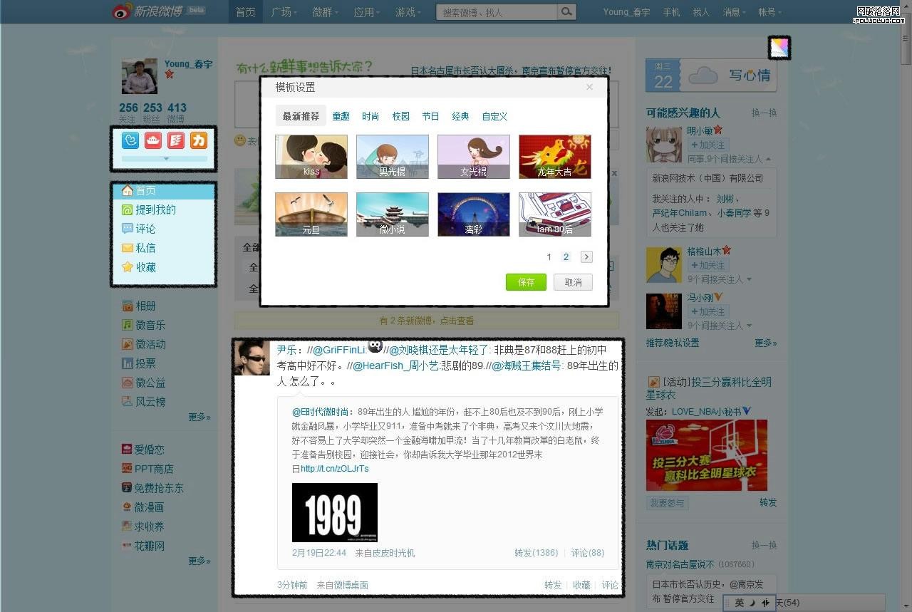 鼠標點擊(click)、滑過(hover)、激活(active)操作仍是當今webPC端上最重要的幾個交互方式。新浪微博上大部分的互動操作也來自於此。以V4寬版為例當前微博主站可以有鼠標交互操作的模塊大致包括:頂導,左側欄導航,勳章列表,feed區,右側欄皮膚選擇按鈕,皮膚選擇彈層……