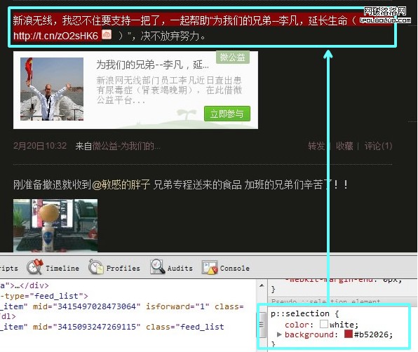 但是微博主站有不同的皮膚,深深淺淺。當遇到一個暗色皮膚背景,依然顯示藍底兒白字,那效果就不是特別帥氣了。這時候,其實可以考慮用偽類selection為網頁文字的高亮提供了設計方案,來改變反選展示效果。鼠標選中文字後可設置相應的背景色和文字色,甚至是透明。簡單一個屬性就體現了產品對用戶操作的關懷,從而提升用戶使用感受。