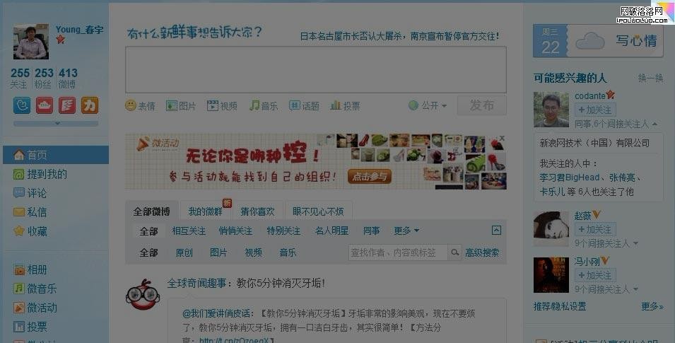 在攝影作品中,講究布局不要太死,要給照片“留口氣”。借鑒到網頁設計中,這個說法同樣有它的存在意義。先看看我們的微博首頁,各個模塊之間擠在一起,看上去布局有點悶,這時候,右上角那個彩虹按鈕就成了點睛之筆。