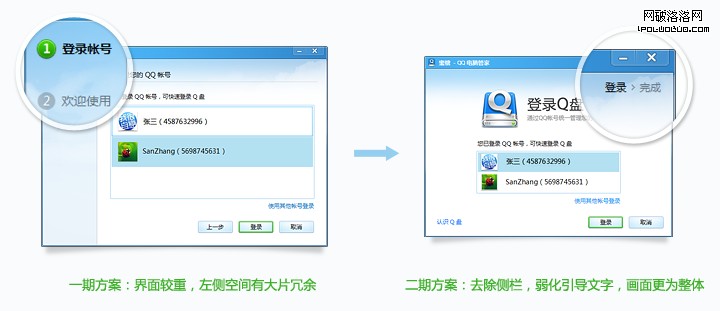 一期方案中,為了凸顯首次啟用Q盤的便捷性,將步驟引導做了最大化處理。但隨著對產品的反復思考,設計師認為這樣的方式存在“空白過多”、“界面不精致”等問題。對此,Q盤首次啟用界面做出了“放血”的改變。從一期(左圖)到二期(右圖),界面尺寸從600*420改為520*380,弱化步驟引導,輕量界面效果。
