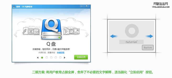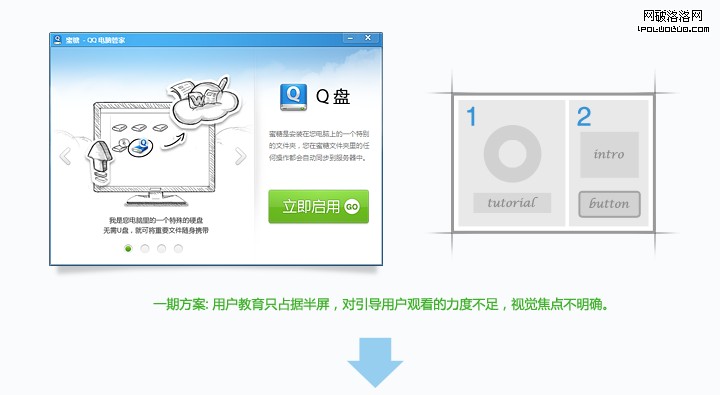 傳統軟件安裝的用戶教育通常放置在安裝完成之後,用戶可以選擇看與不看。但Q盤無需安裝,只是登錄即可使用。為了在用戶首次啟用時引導用戶了解Q盤,吸引用戶使用,Q盤中的用戶教育采用了提前處理。