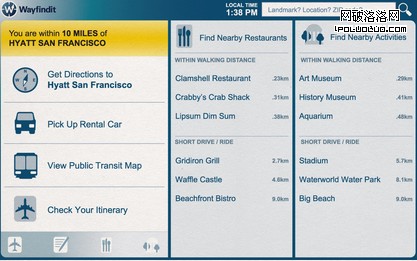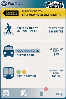 想要知道去飯店怎麼走?Wayfindit的Trip Planner知道怎麼到那兒——步行、打車或者使用公共交通(如果它知道那兒沒有可租用的車,就采用公共交通)。如果旅行者正在使用這個應用,他只需要一次點擊就能呼叫正確的電話號碼找到交通工具。