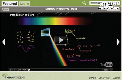 Khan Academy的視頻內容是其網站的焦點,我們做了重新設計,使視頻處於前端,免於干擾。視頻占滿屏幕,輔助信息在不需要的時候都消失了,以提供沉浸體驗。當導航出現的時候,它也是最小化的——一切都是為了學生更好地學習。評論和提問部分都是最小化的,並且除非用戶需要,評論和提問部分的內容是不會加載的,以節約加載時間。鍵盤上的一些快捷鍵讓導航更為容易。