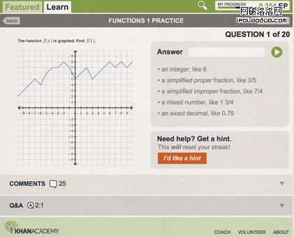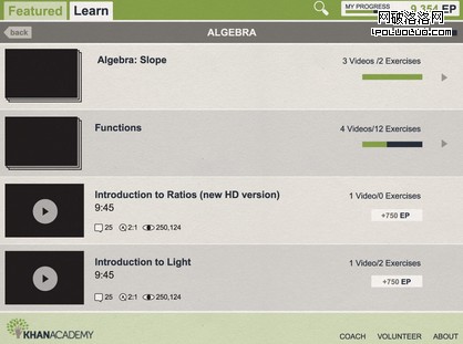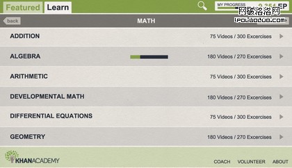 在“學習”標簽下,有一個內容明細,Khan Academy的上千學習課程和聯系都分成目錄和子目錄,易於檢索。在這裡也有一個進度條,提示學生各個標簽下課程的學習進度。
