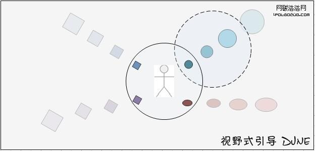視野就是我們能看見的景觀范圍,隨著人的位置移動而變化,因此視野變化在一定程度上可以反應一個人的行為路線。我們的產品中,即使對於高級用戶,有些功能也是他不需要的,視野型引導將通過用戶的行為和意願來判斷,因而將更加貼合單個用戶的行為特點。