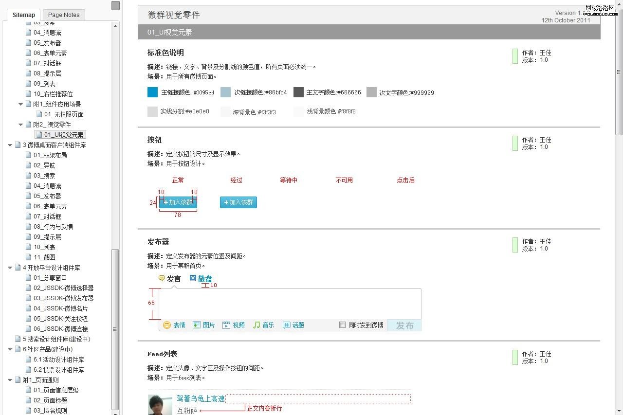 第二步:組件分類。找出這麼多的組件,如何讓使用者需要時能夠方便快速的找到其中的某一個,我們對組件進行了詳細的歸類。以公共組件庫分類為例,包括了框架布局、導航、標簽及頁碼、對話框、列表、消息流、發布器、表單元素等11類基本組件,公共組件可供所有產品設計統一參考,此外,各產品線可根據各自產品特點制作相應的特殊組件分類,將公共庫與各自的組件庫結合使用,就可以快速搭建各自的產品頁面了。