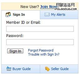 上圖是www.Made-in-China.com的登錄注冊口,,這塊區域的可點擊區域太多,為了保證頁面的簡潔的視覺效果,Button並沒有保持統一,但是登陸口,注冊、找回密碼,指南都在同一區域內,這是一種行業規范的統一,大都數用戶都會意識到注冊入口在登陸口的附近,所以注冊口沒有做成Button而只是做了一個簡單鏈接。