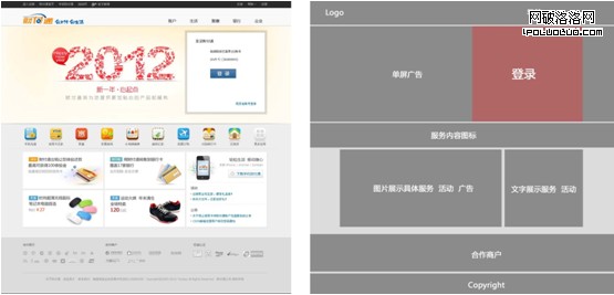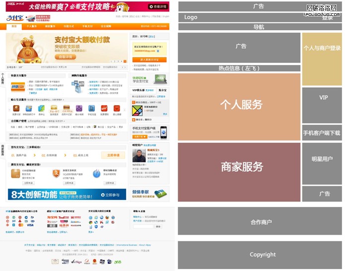 1、塊面多:頁面小塊面太多,容易讓用戶眼花缭亂。用戶群有個人服務和商家服務,雖然在頁面上有大塊的區分兩者,但是對用戶來說,還是有些混亂(請看下圖);
