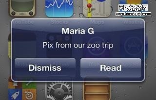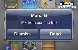 橫幅通知是在iOS5中出現的新特性,是顯示在屏幕頂部的橫條,幾秒鐘後會自動消失。一條橫幅通知會顯示程序的小圖標(低分屏下顯示29×29的圖標,高分屏顯示58×58的圖標),程序的名字和通知的內容。小圖標可以幫助用戶一眼就看清楚是哪一個應用程序在提醒他們。