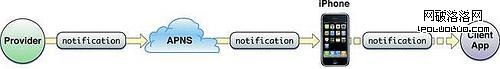 應用程序的推送通知是這樣發布的:該應用的遠程服務器(Provider)先發出一條通知給蘋果的推送通知服務(Apple Push Notification service, APNS),蘋果的通知服務器再把這個通知推送給所有安裝了這個應用的iOS設備。