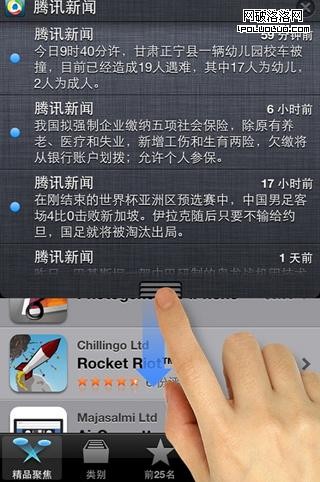 如果是在游戲裡面,比如水果忍者這種游戲,為了避免手指不小心滑到屏幕外而打開了通知中心,iOS5提高了打開通知中心的難度:先從屏幕頂部下拉出現有類似防滑紋的下拉條,出現下拉條後再次向下拖拽,才可打開通知中心,否則幾秒鐘後下拉條會自動收起。此處帶防滑紋下拉條的設計可以幫助新用戶迅速建立下拉打開通知中心的心智模型。