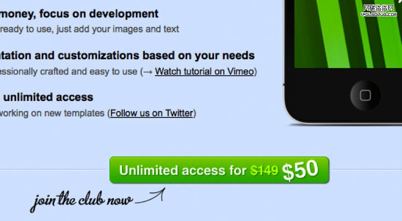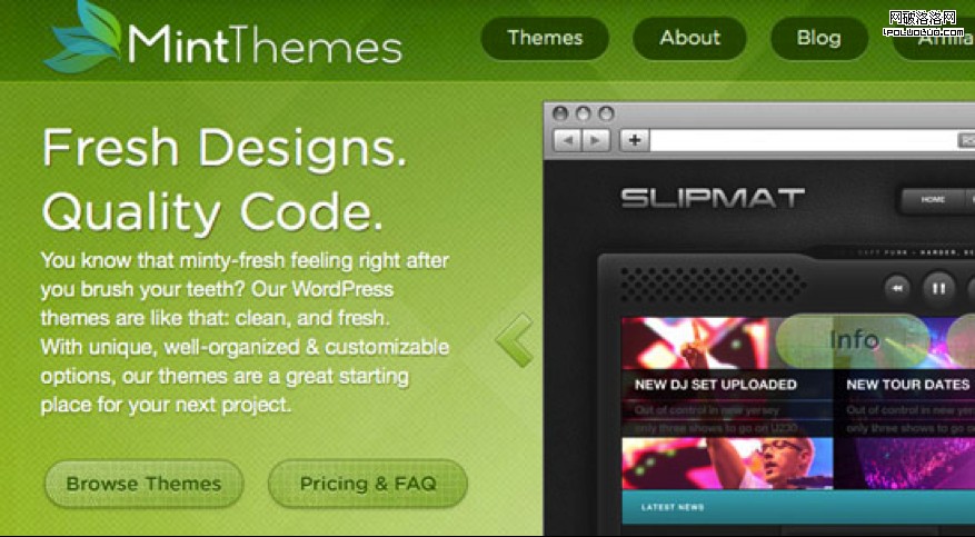 (如上圖)MintThemes網頁上的行為請求按鈕沒有用高調的手段來呼吁用戶的注意,而是采用了留白的形式,這同樣能夠刺激用戶采取行動。網頁上方和底部的行為請求按鈕都是采用了這種方式。