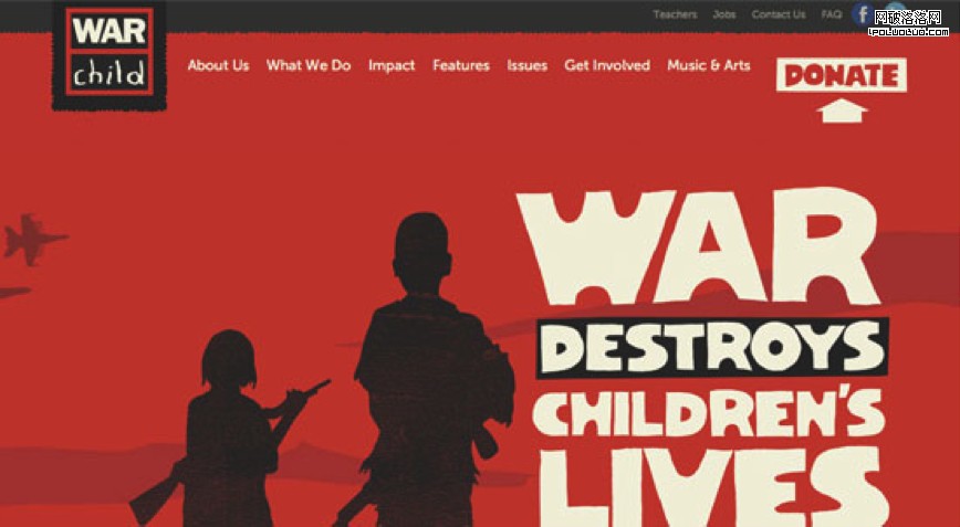 (如上圖)“Donate”,該行為請求按鈕用來號召大家捐贈來幫助戰爭中的孩子。作為二級菜單被放置於頁面頂部能有效誘發用戶操作行為。而且在策略上,這個文字被置於一塊背景之上,也似乎在鼓勵用戶在浏覽了其他頁面後再次回來。