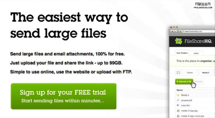 (如上圖)FileShare HQ網頁上的行為請求按鈕告訴用戶成為會員能夠得到的好處——幾分鐘內上傳文件。