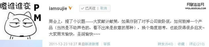 “產品無間道——如何毀掉對手產品”,這個看起來頗具陰暗色彩的話題來自於新浪筒子的一條圍脖,下圖原景再現: