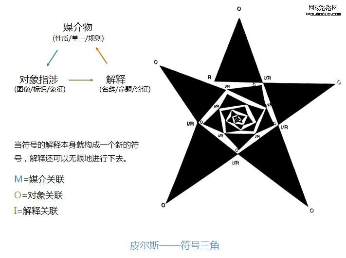 相對於索緒爾的研究方法是圍繞能指和所指兩個側面展開的二元化,皮爾斯則是三元化的研究方法。他認為符號學含有符號、客觀對象、解釋這三項,彌補觸及了索緒爾沒有涉及的部分。皮爾斯是美國的實用主義哲學者,他的符號學理論建立在對意義、表征、符號概念的邏輯學研究基礎之上,概括起來為三種范疇:設計感覺質,人的經驗,思維三個層面。即媒介物、對象指涉、解釋這三要素構成的三角形關系。他的理論具有普適性,適用於任何領域,被稱為“廣義符號學”。聽到為數最多的要數對象關聯層下的三個下位符號:圖像符號(icon)、標識符號(Index)和象征符號(Symbol)。