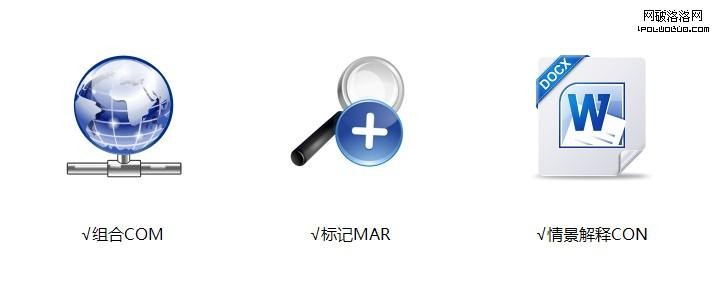 符號的建立需要經歷符號化的過程,在符號的操作方法具體包括“代入”、“添加”、“結合”、“迭代”等方法。運用到具體的圖標組合規則中,結合代數運算符,圖標組合的方法也自有一套圖標代數理論:組合COM,標記MAR,情景解釋CON,增強ENH,倒置INV,索引IDX。