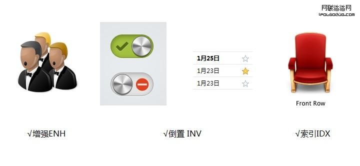 索引運算符IDX(X)用於抽象地得出圖標的屬性。如圖Font Row是Mac OS X中的原生播放器,它利用隱喻的手法,將舒適的座椅作為該軟件的Logo圖標,目的在於讓用戶從舒適的座椅聯想到美妙的視聽享受。
