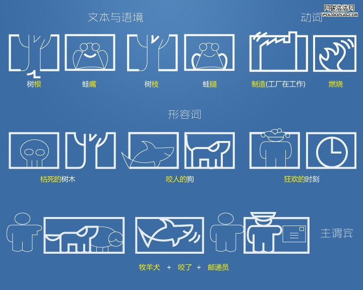組合COM(X,Y),把X和Y的語義合並來進行概念的合並。如用地球和數據連接的兩個概念組合為網絡信息連接這個圖標語義。
