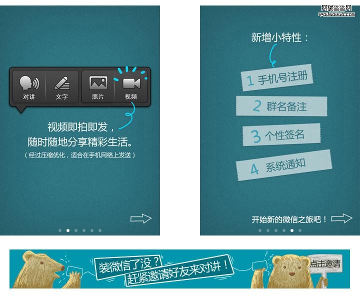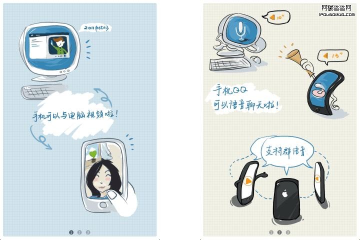 QQ2011 for iPhone安裝後的新功能介紹頁面,個人非常喜歡這種輕薄的畫風,這裡采用有趣生動的手繪漫畫風格,比起方方正在實線實面的絢麗圖形介紹更有親和力。