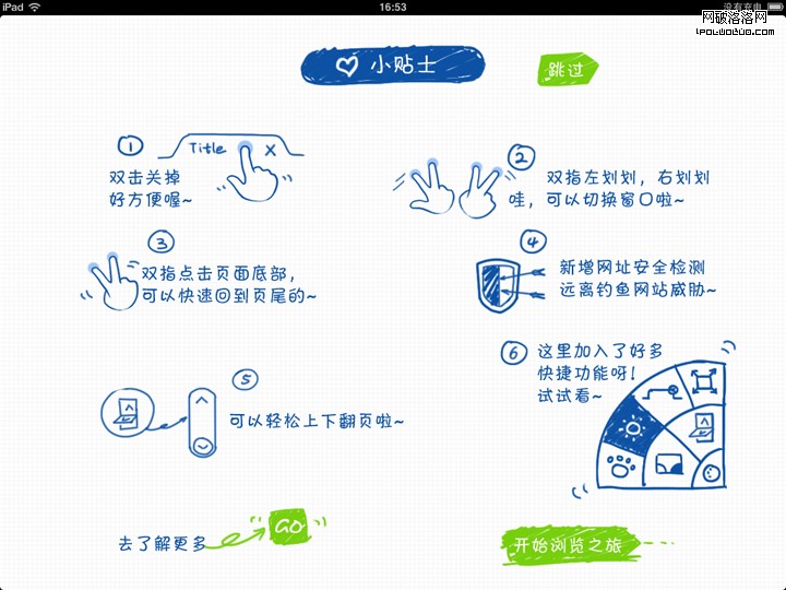 QQ浏覽器HD版的小貼士,比起普通的圖文幫助介紹,這個手繪的介紹界面更讓用戶能夠接受和有興趣閱讀它。