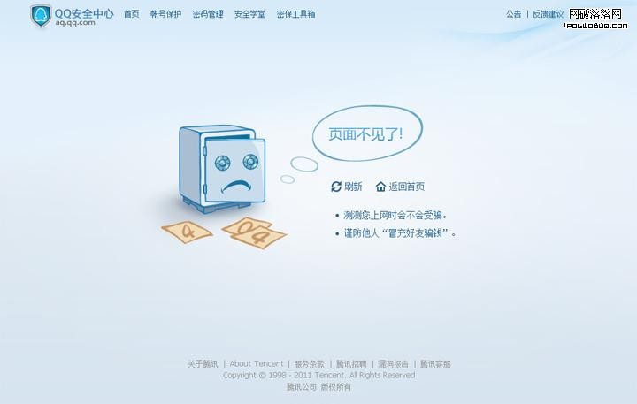 QQ安全中心404錯誤提示頁面,采用可愛的擬人化手繪表現手法。讓一個錯誤的頁面變得親切。