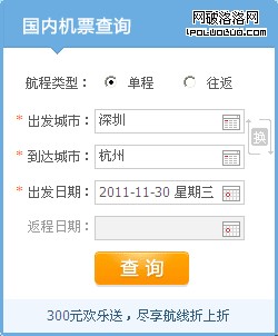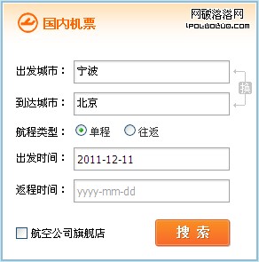 大多數機票查詢的入口,都是這樣,單程/往返使用兩個radio,放在最前面;選擇單程時禁用往返,或者隱藏返程時間輸入框。