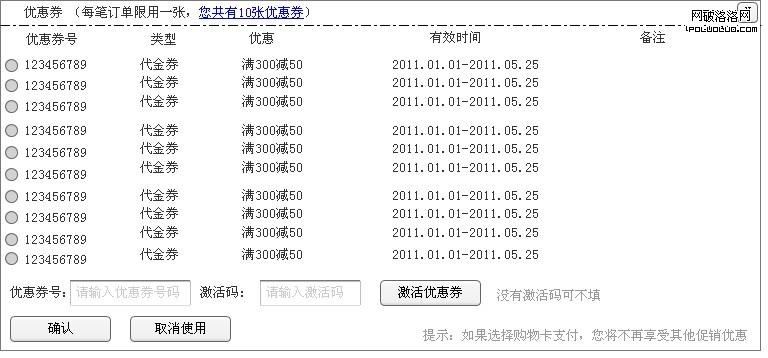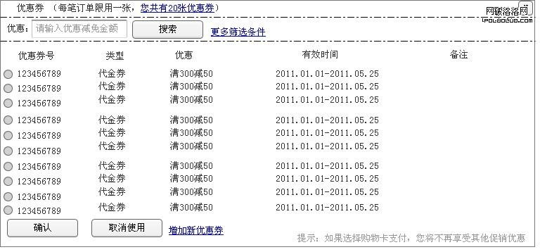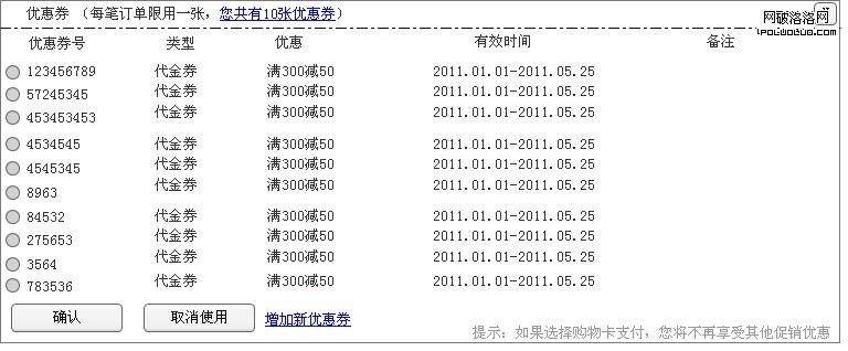 我們在互聯網上經常買東西,也會經常收到優惠券,最近有空做了一個小調研,在一個網站上,有30%的用戶擁有超過10張的生效優惠券,但是,當我們使用優惠券的時候,我們發現一個問題,很多網站在購物結算頁面只能顯示10張優惠券,那麼,如果多於10張優惠券後,我們怎麼選擇使用呢?