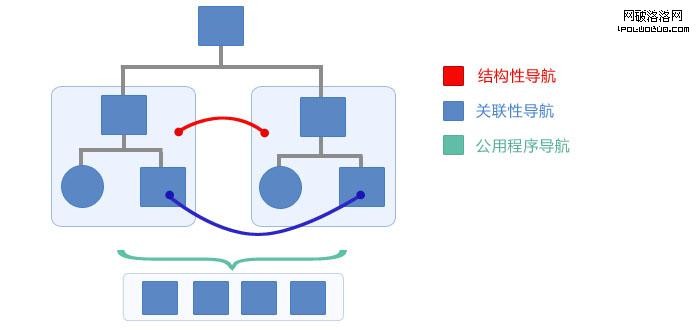 網頁導航的劃分有不同的維度。網頁導航按照作用范圍的不同可以分為三大類:結構性導航、關聯性導航和公用程序導航。根據《web 導航設計》,三者的關系可描述如下: